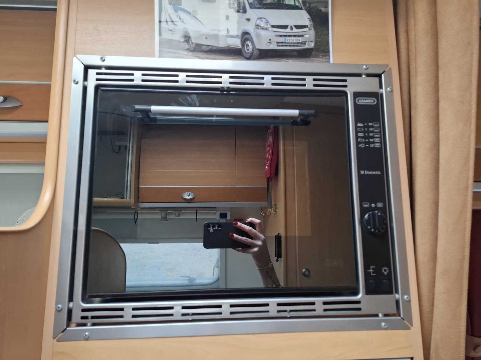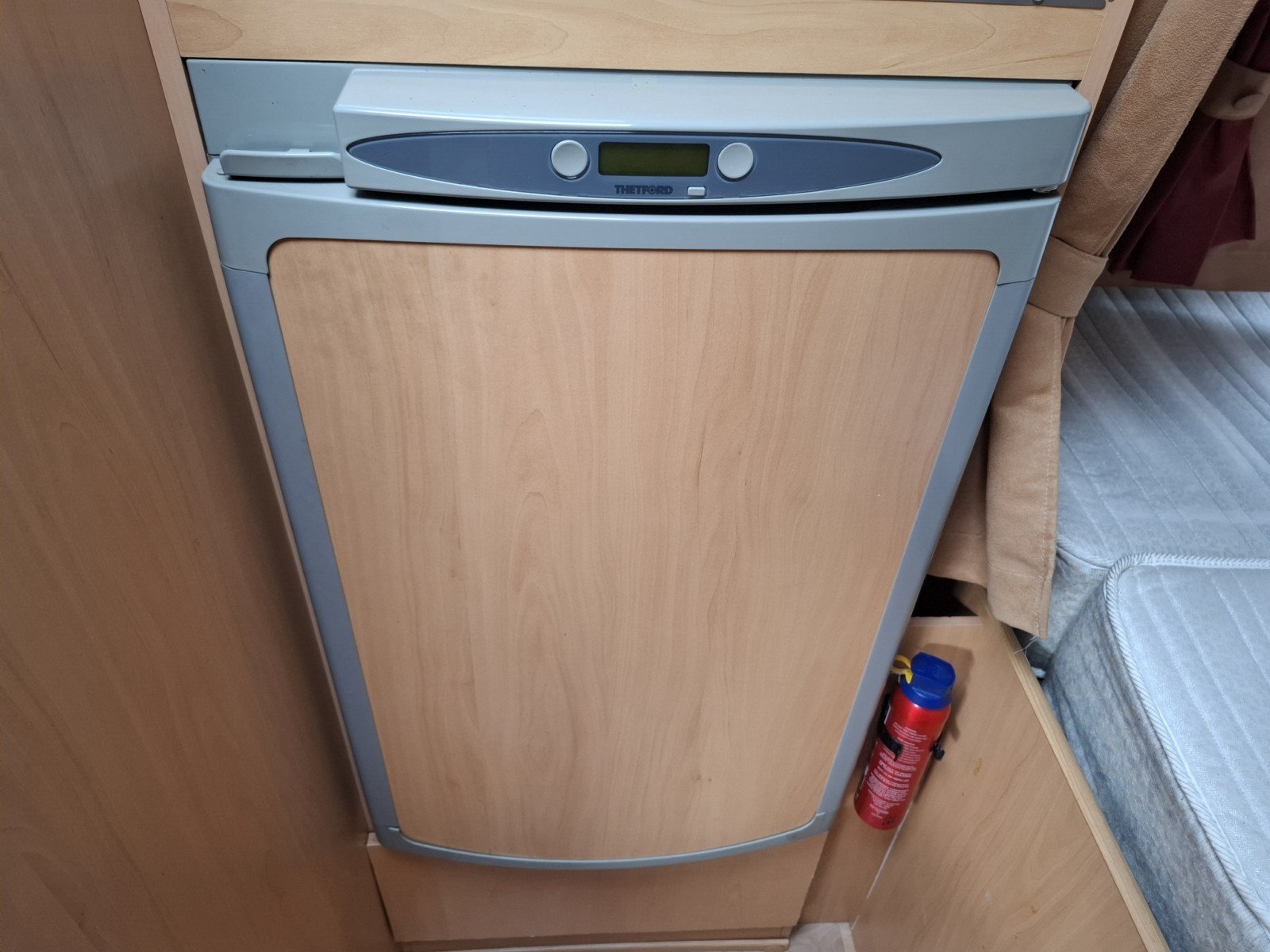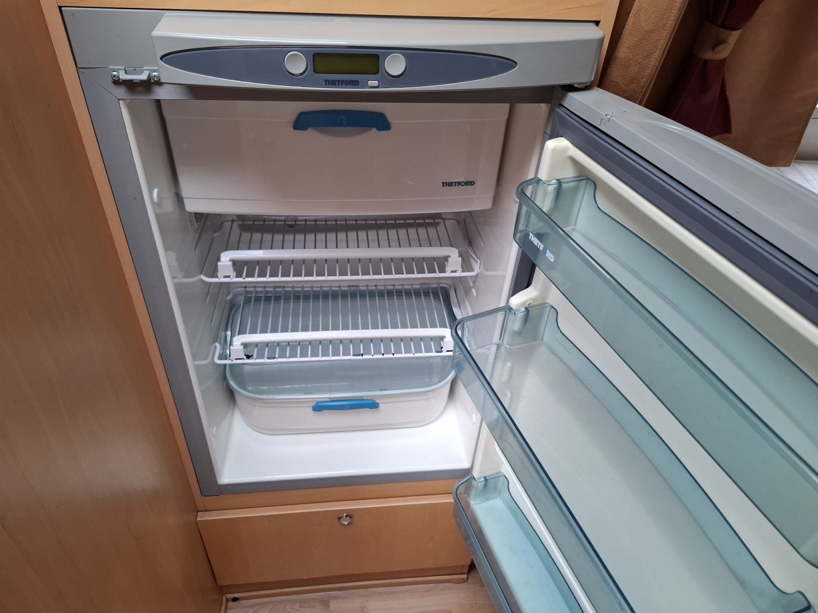 Moving beyond the dinette, on the offside, you will find a combination oven and grill, alongside a fridge equipped with a freezer compartment. Opposite this, there is ample storage, a sink, and a three-burner gas hob – providing a fully functional and convenient kitchen area.