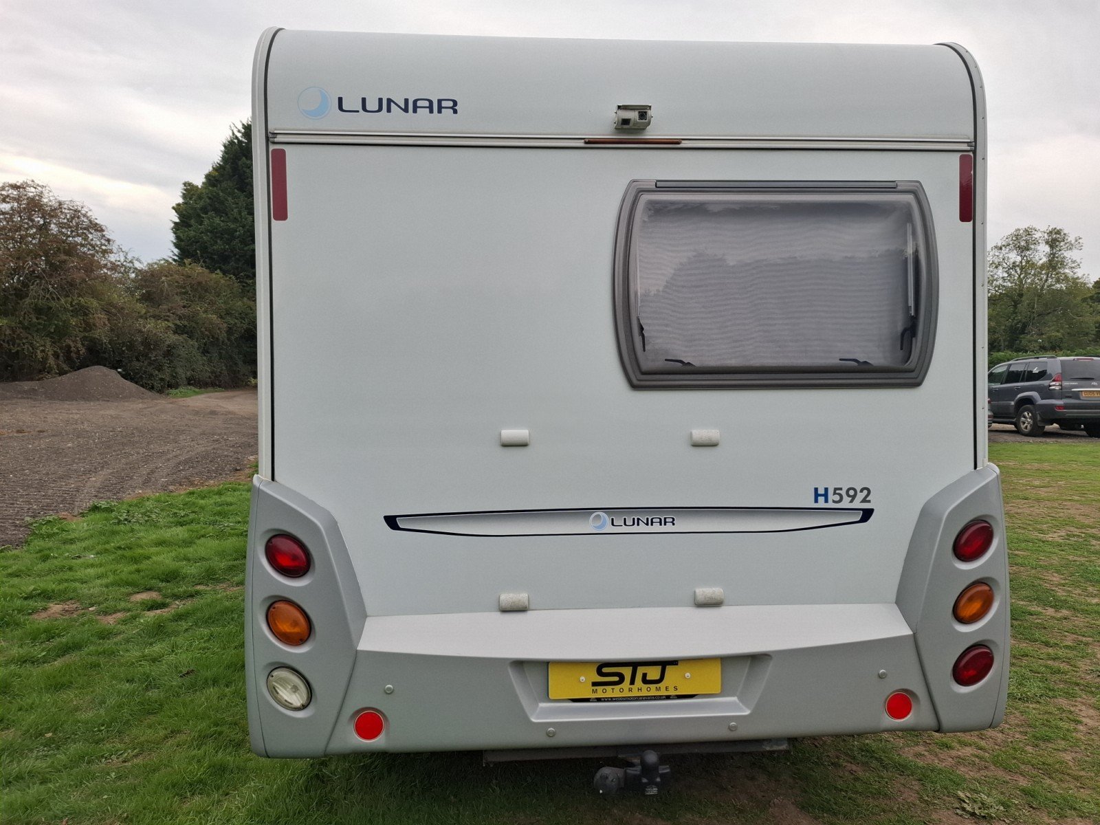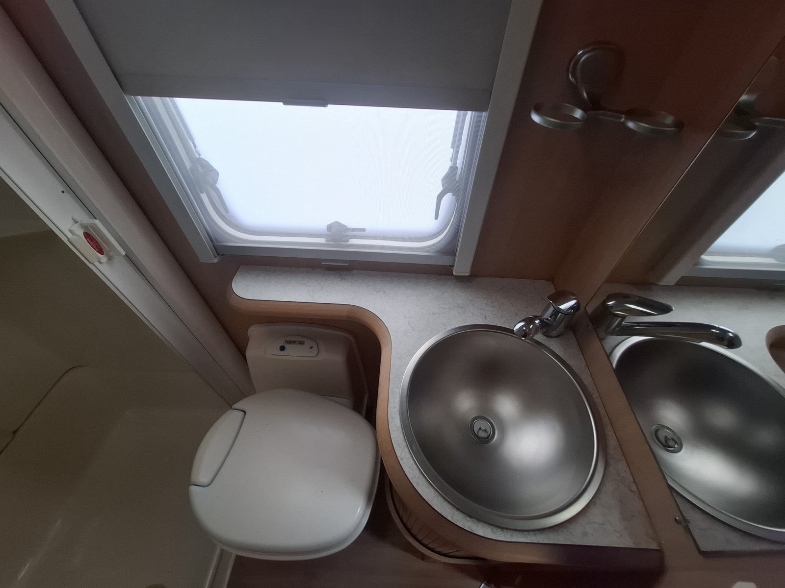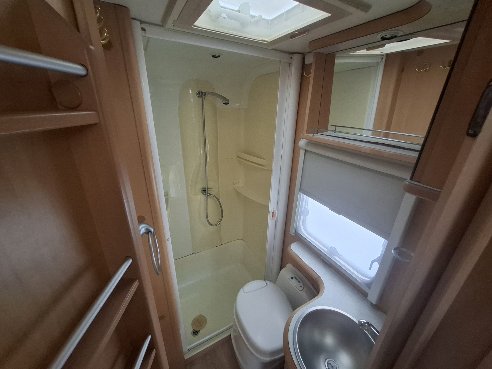 At the rear of the vehicle, a fixed French bed is located on the offside, offering generous under-bed storage and overhead cupboards for additional space. Adjacent to the French bed, you can find a rear bathroom, with a toilet, hand basin and a separate shower. There is a wardrobe conveniently positioned close to the bathroom and bedroom area.