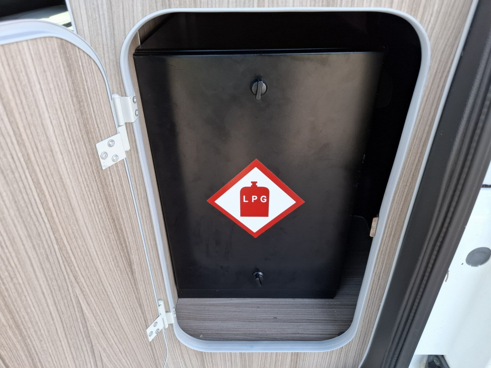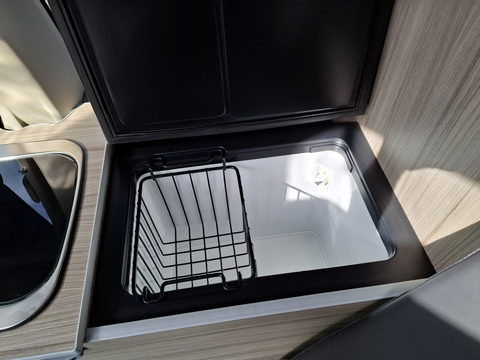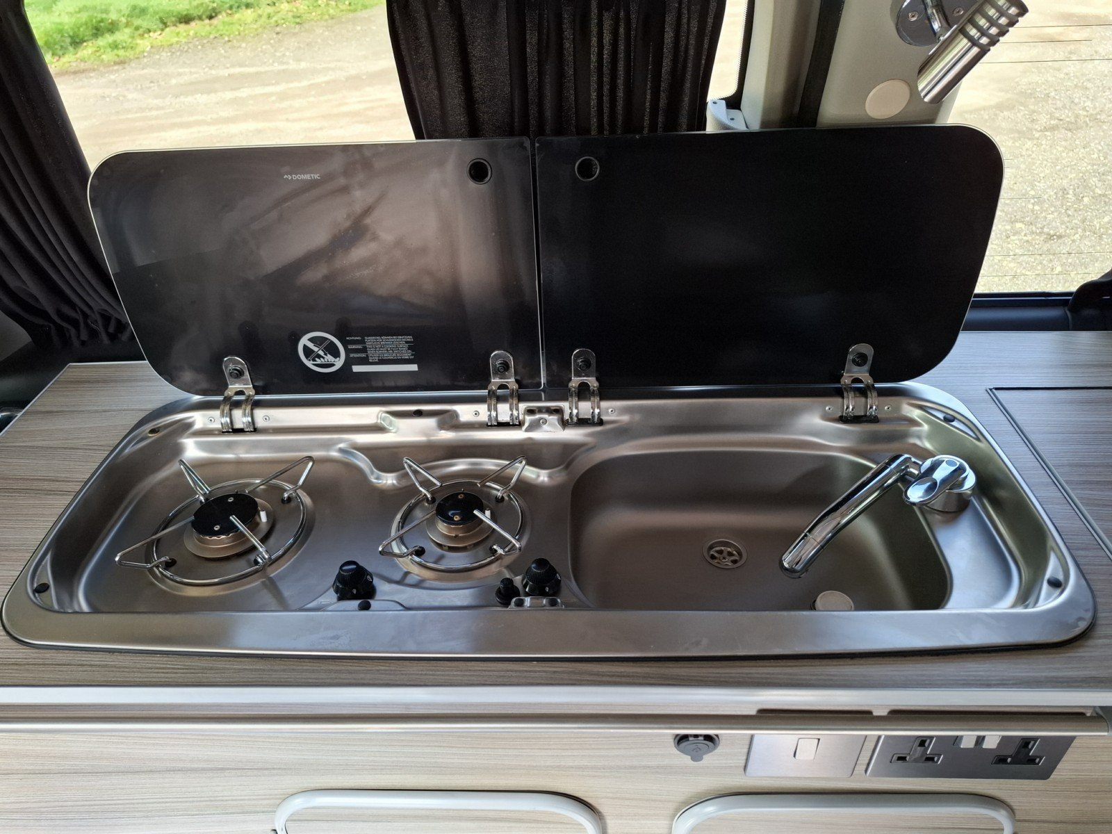An essential side galley features a gas hob with two burners, a top loading fridge, and a sink.