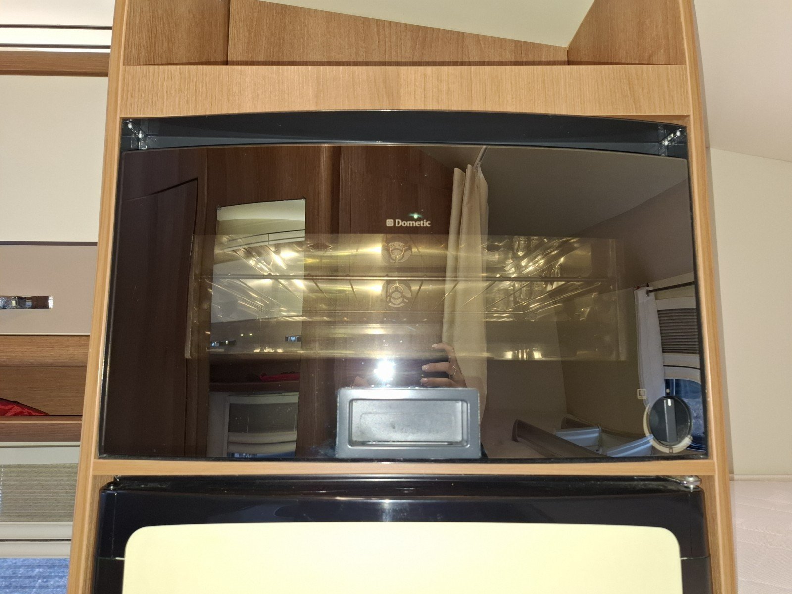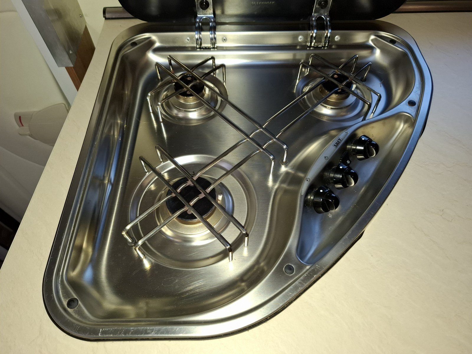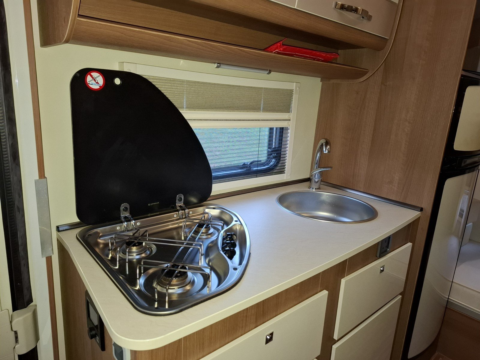 The Plasy 70 features ab offside kitchen, equipped with a sink, a hob with 3 gas burners, an oven, and a large fridge with separate freezer compartment.