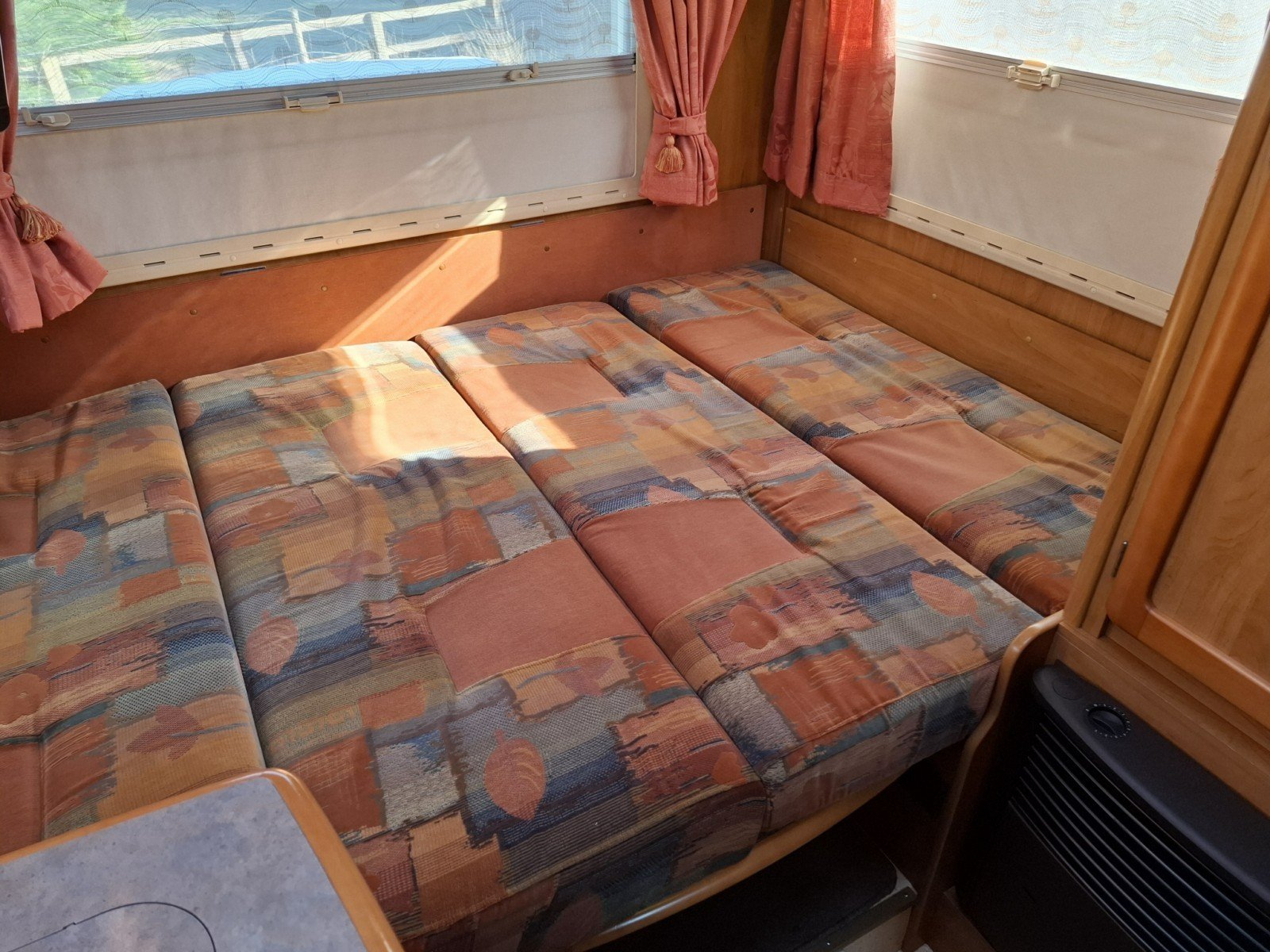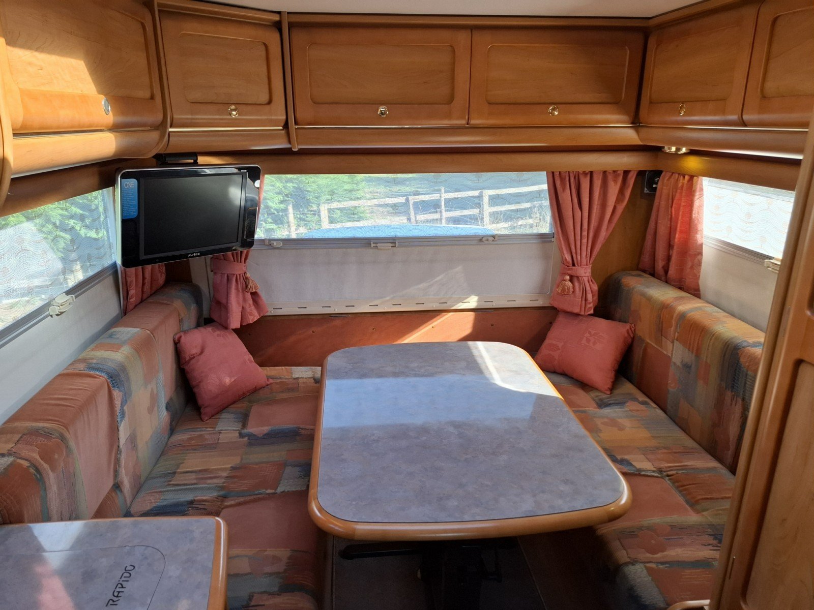 At the rear of the vehicle is a U-shaped lounge with a free-standing table that can be readily converted into a transverse double berth.