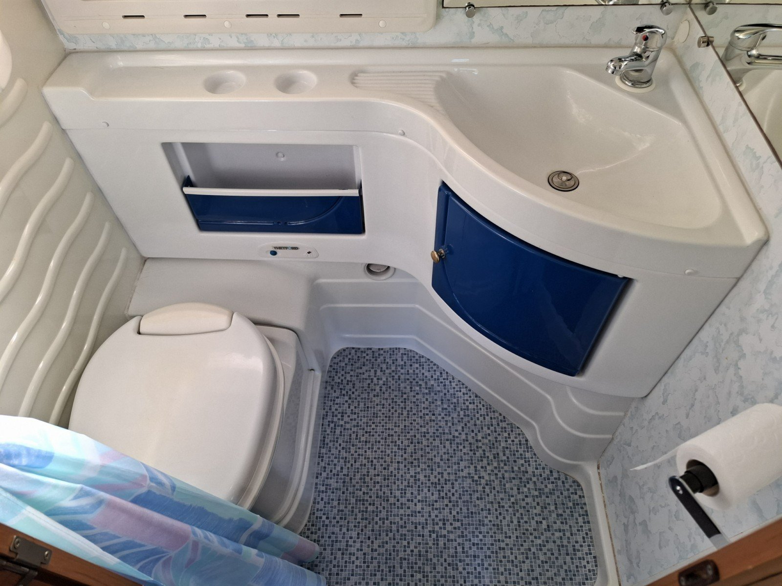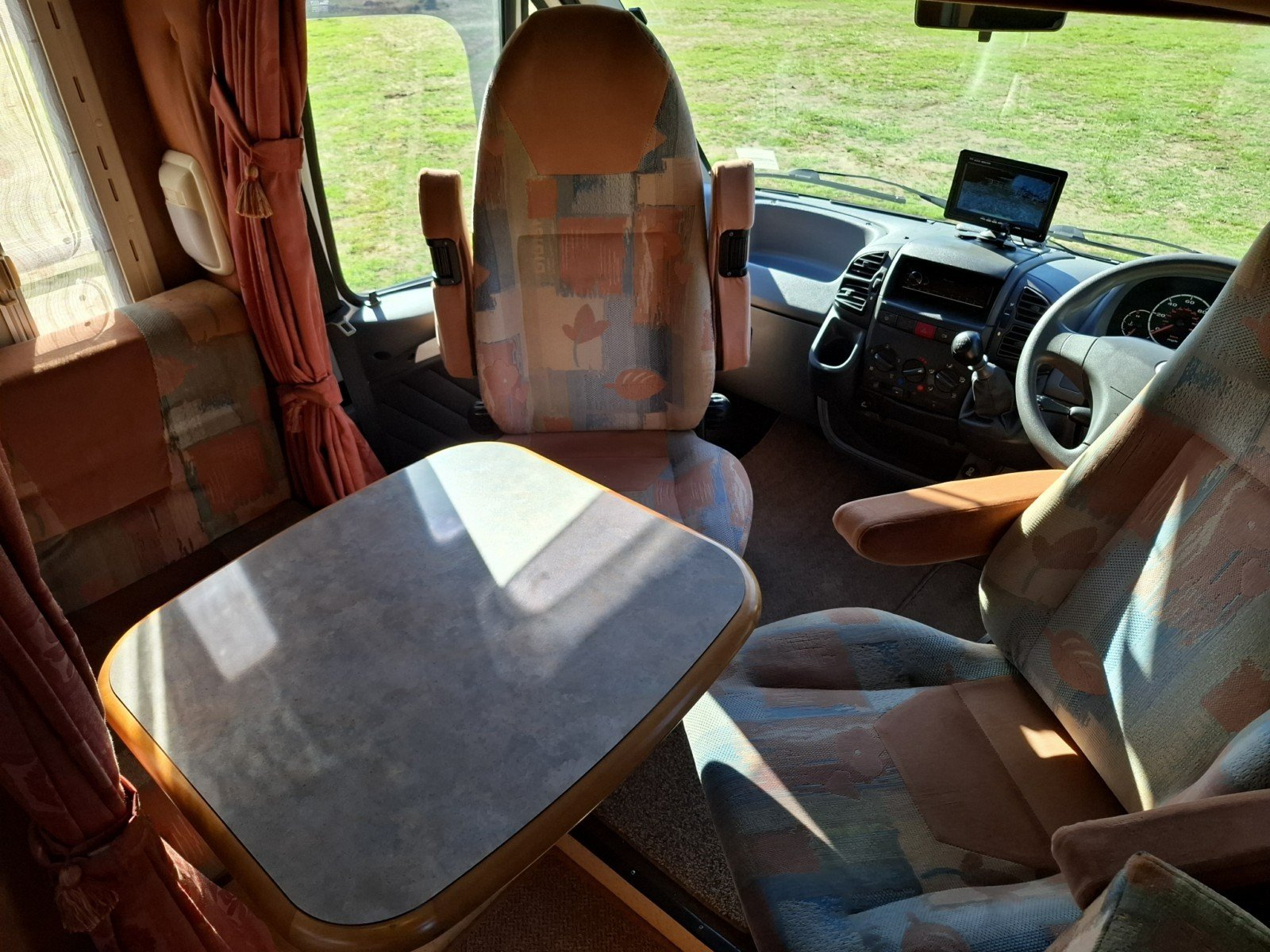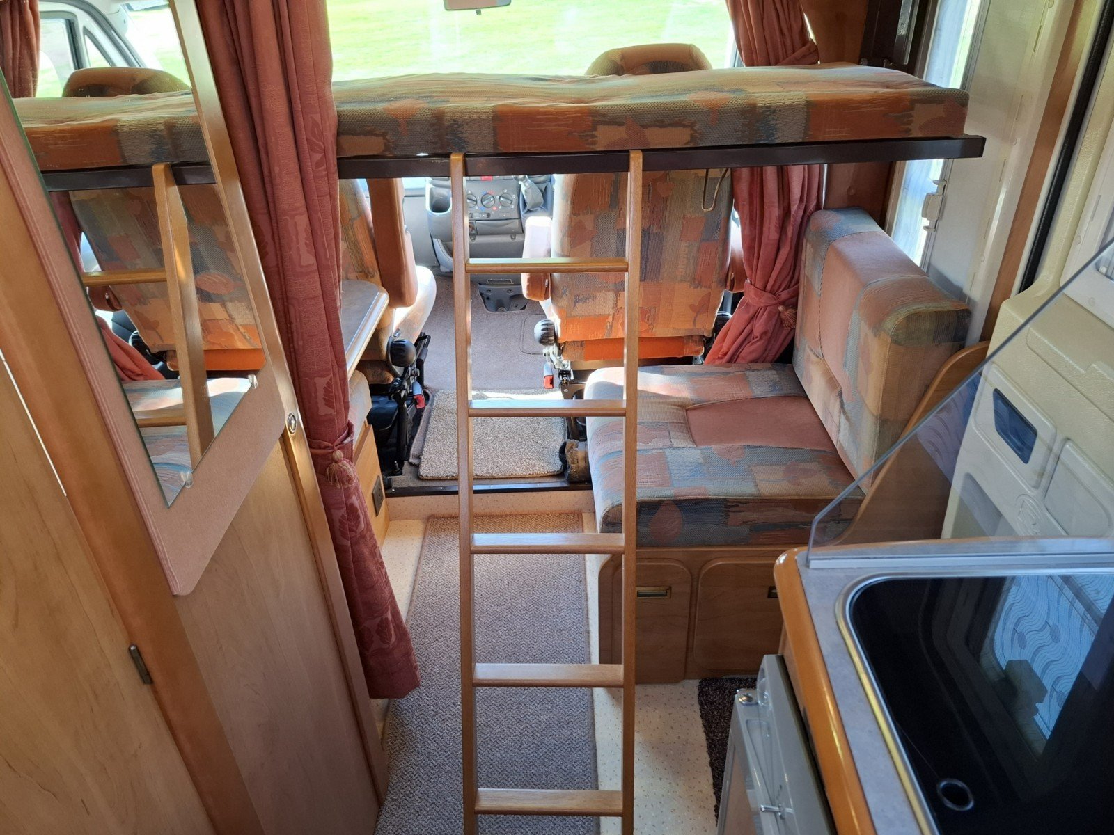 In the forward habitation there are opposing single side seats with a swing table that forms a cosy area for dining, and which can be augmented by use of the swivel cab seats. The single seats can be used to form a single transverse berth. Above the side seats is a fold down transverse single bunk.