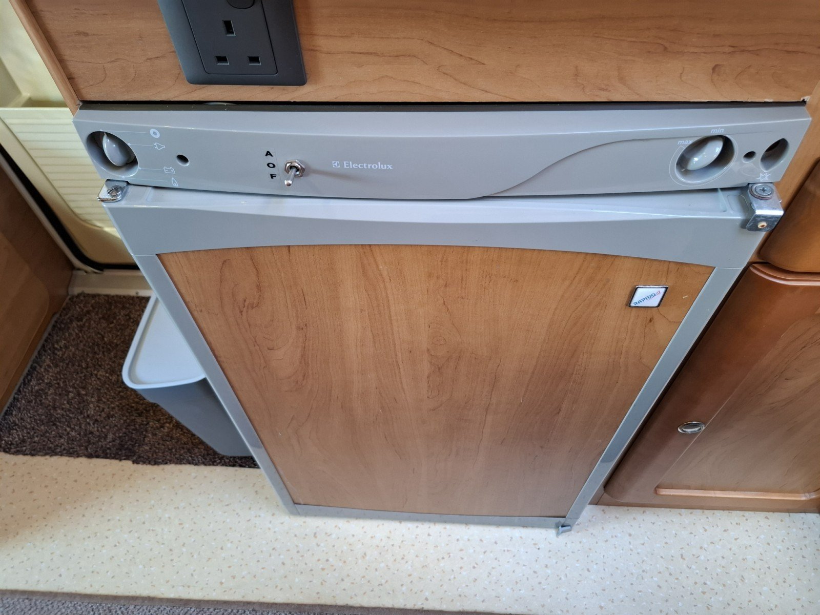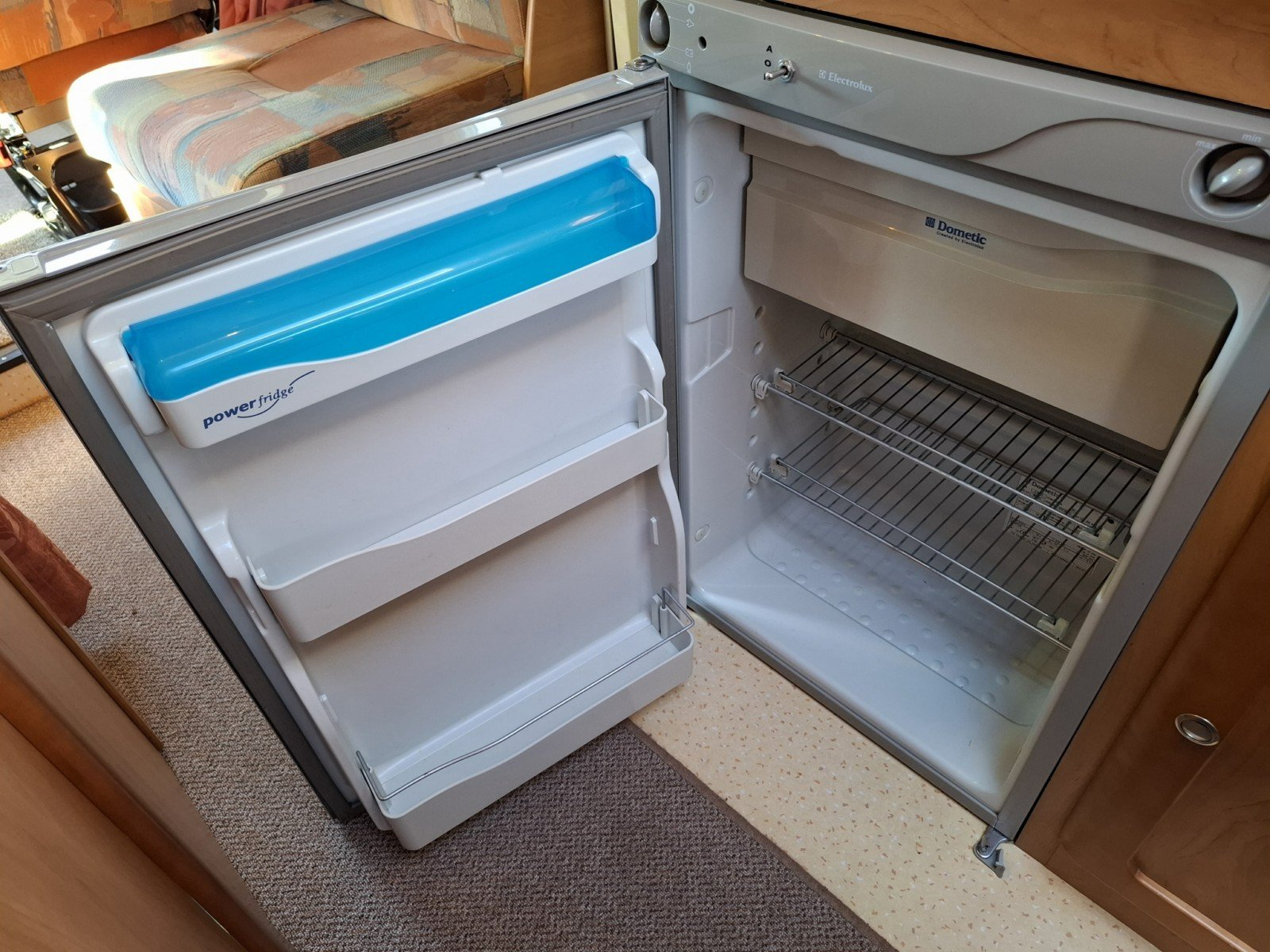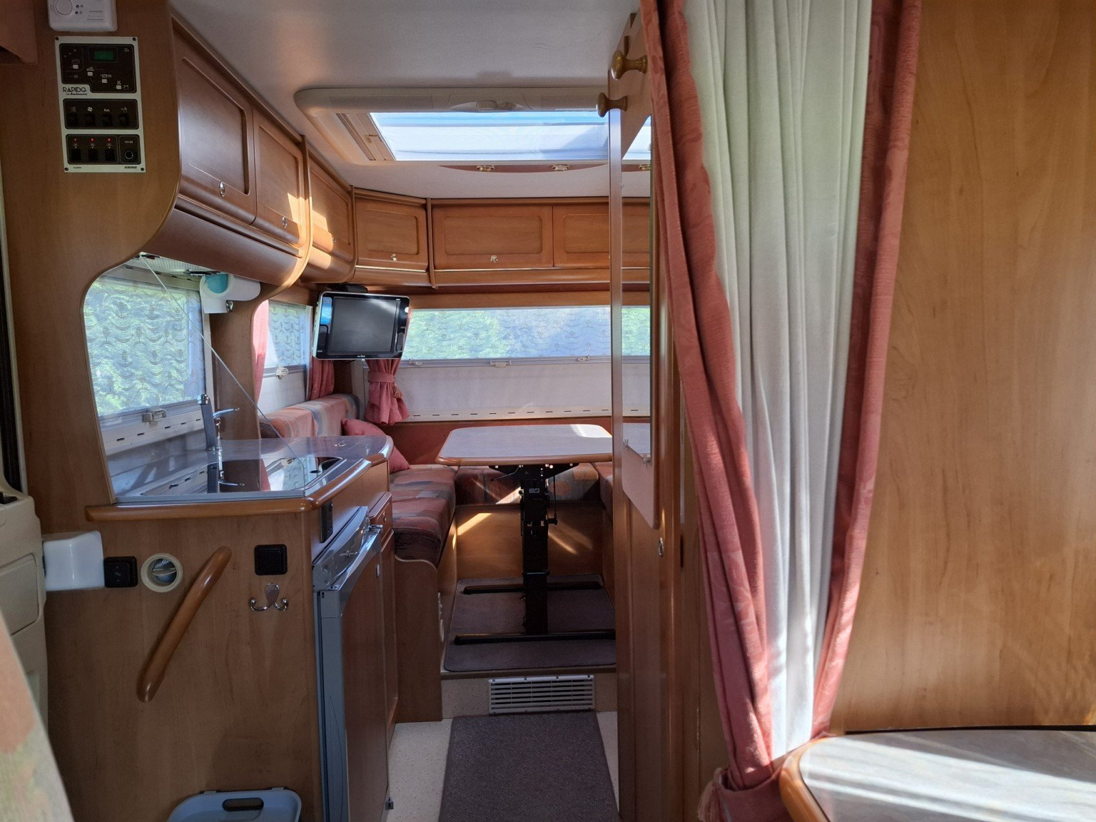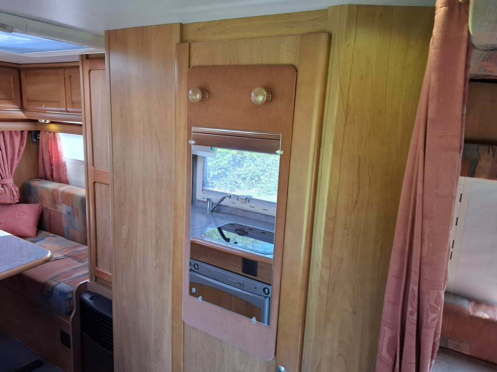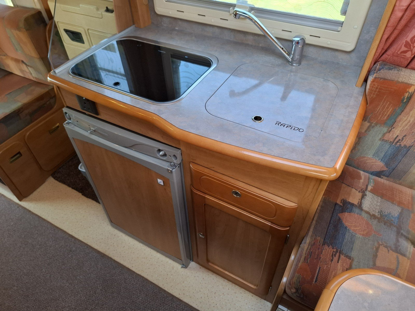 Beyond the offside habitation door there is a kitchen comprising a hob with 3 gas burners, a sink, and a fridge with a freezer box.