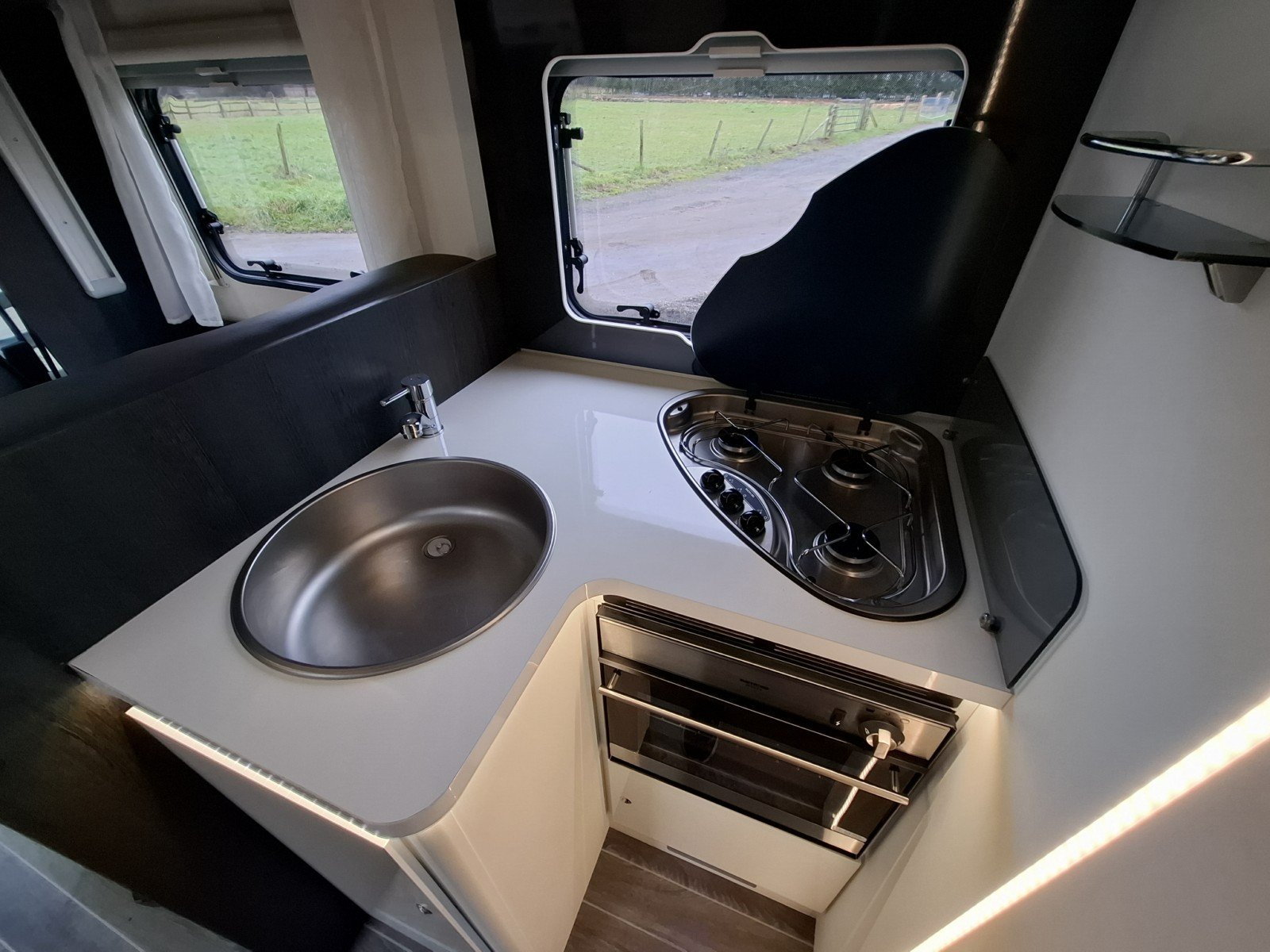 Beyond the nearside habitation door there is a large fridge with a freezer box. Opposite, the central kitchen area has a hob with three gas burners, a combination oven/grill, and a sink.