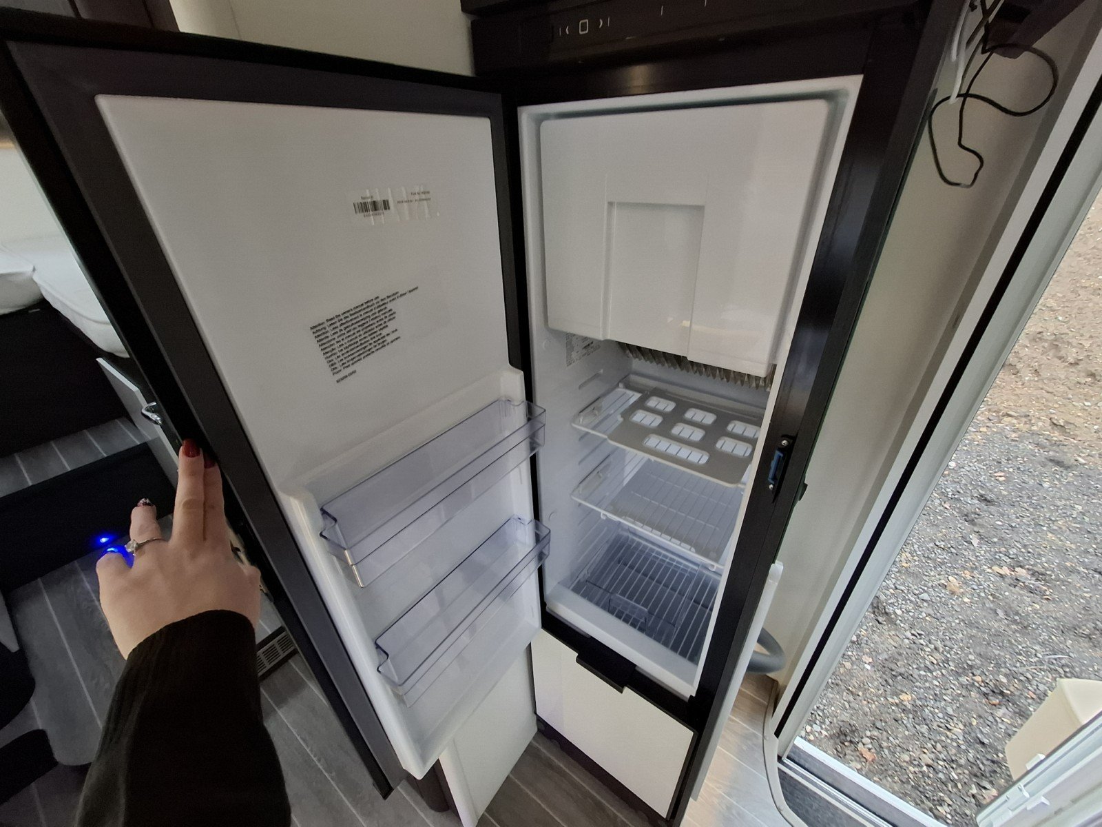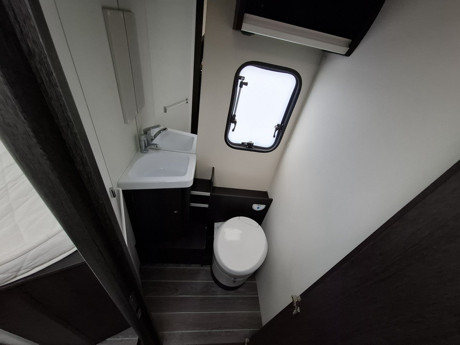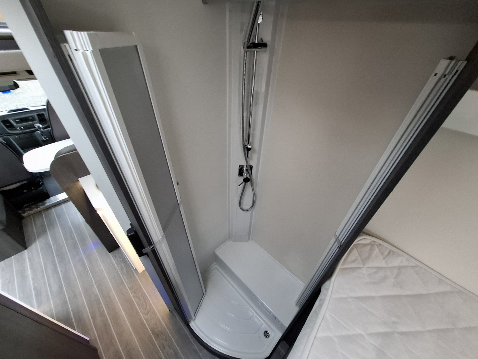 Progressing through the vehicle there is a toilet and hand basin in a compartment where the door can be used to screen off the forward habitation, and a separate shower cubicle opposite.