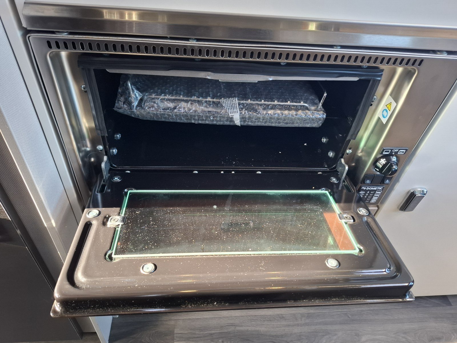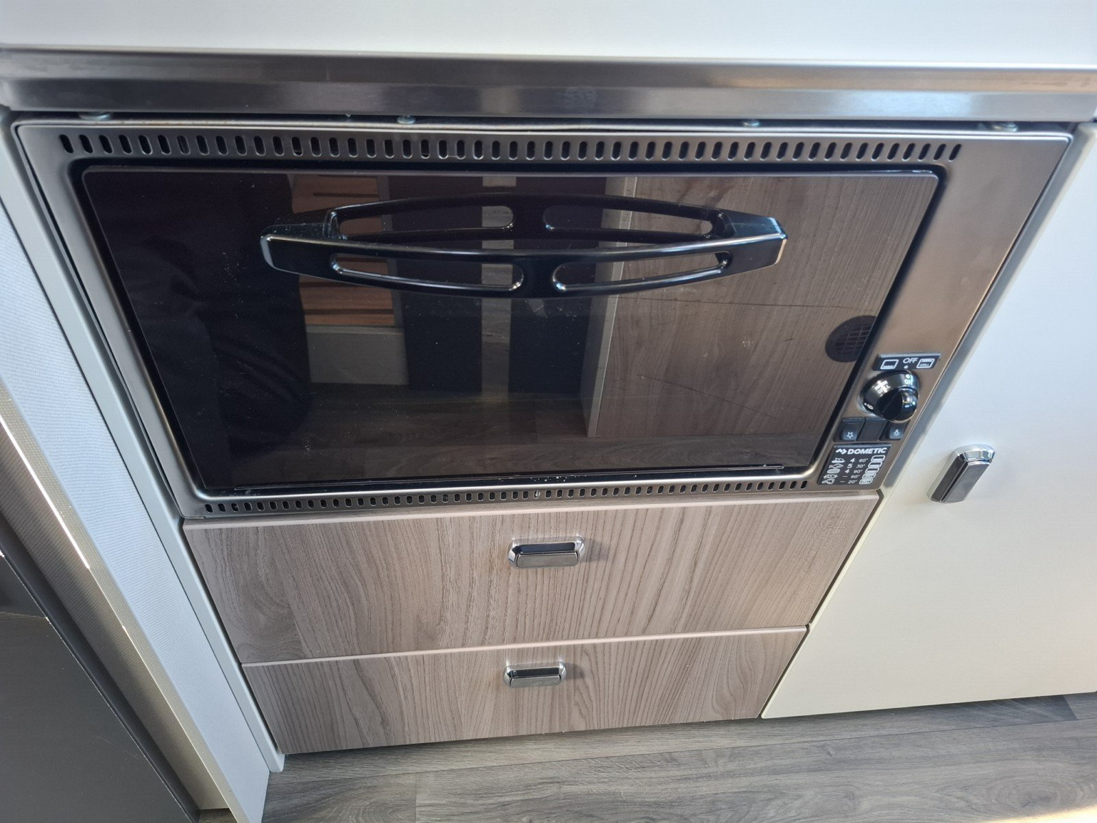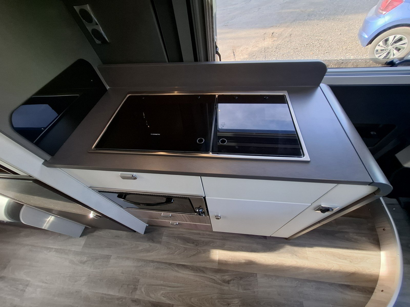 There is a nearside essential kitchen beside the side door with a hob with 2 gas burners, a combination oven/grill, a fridge with freezer box, and a sink.
