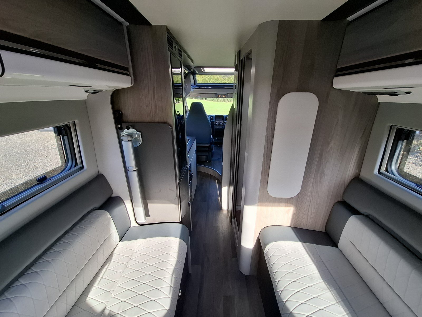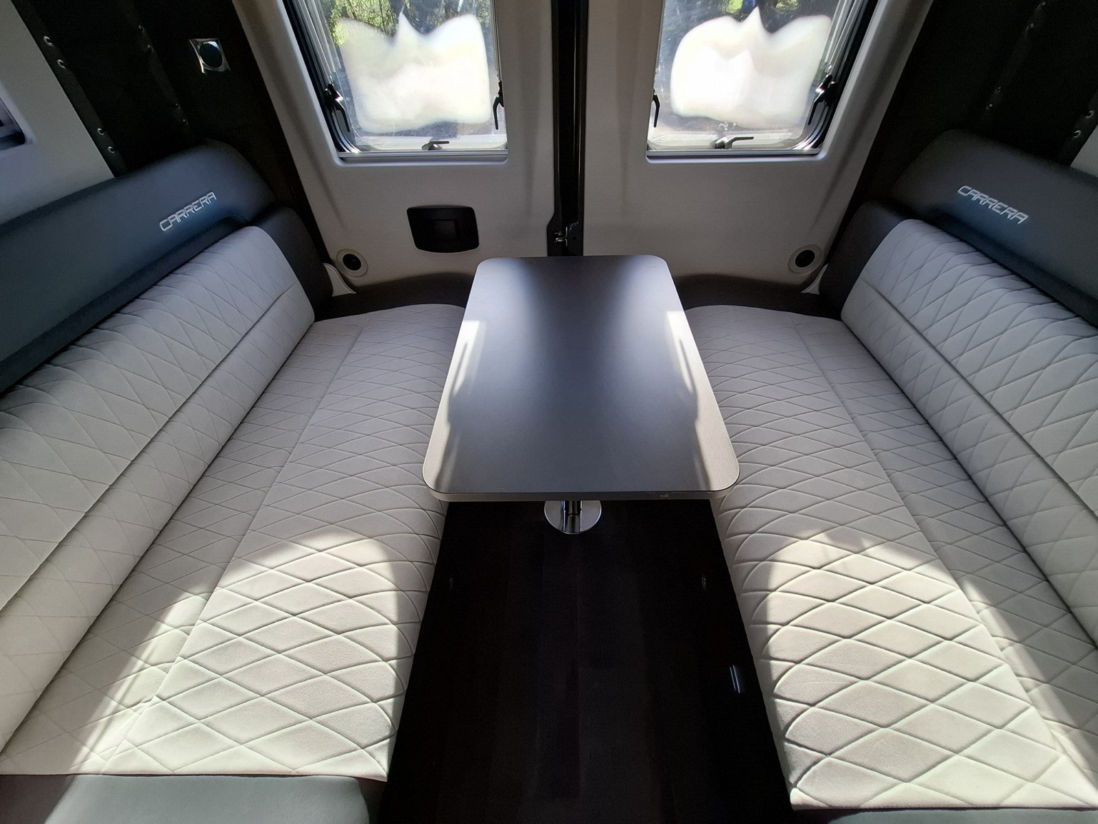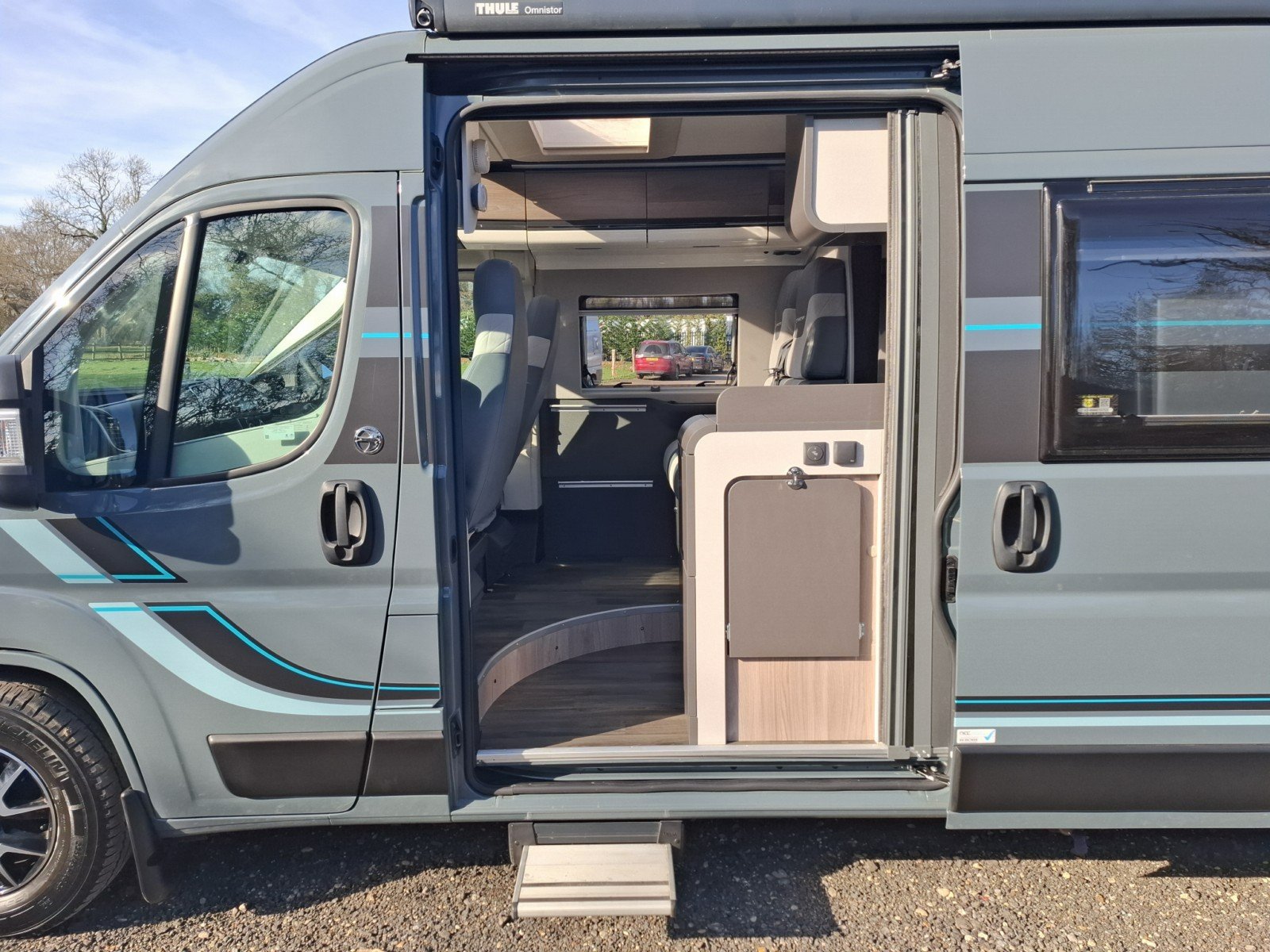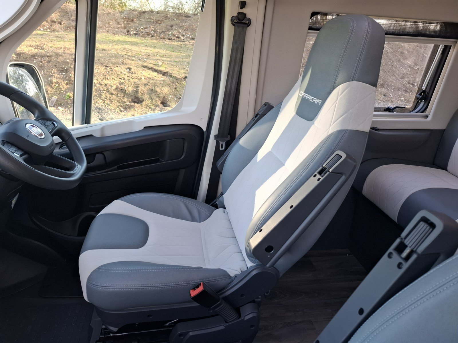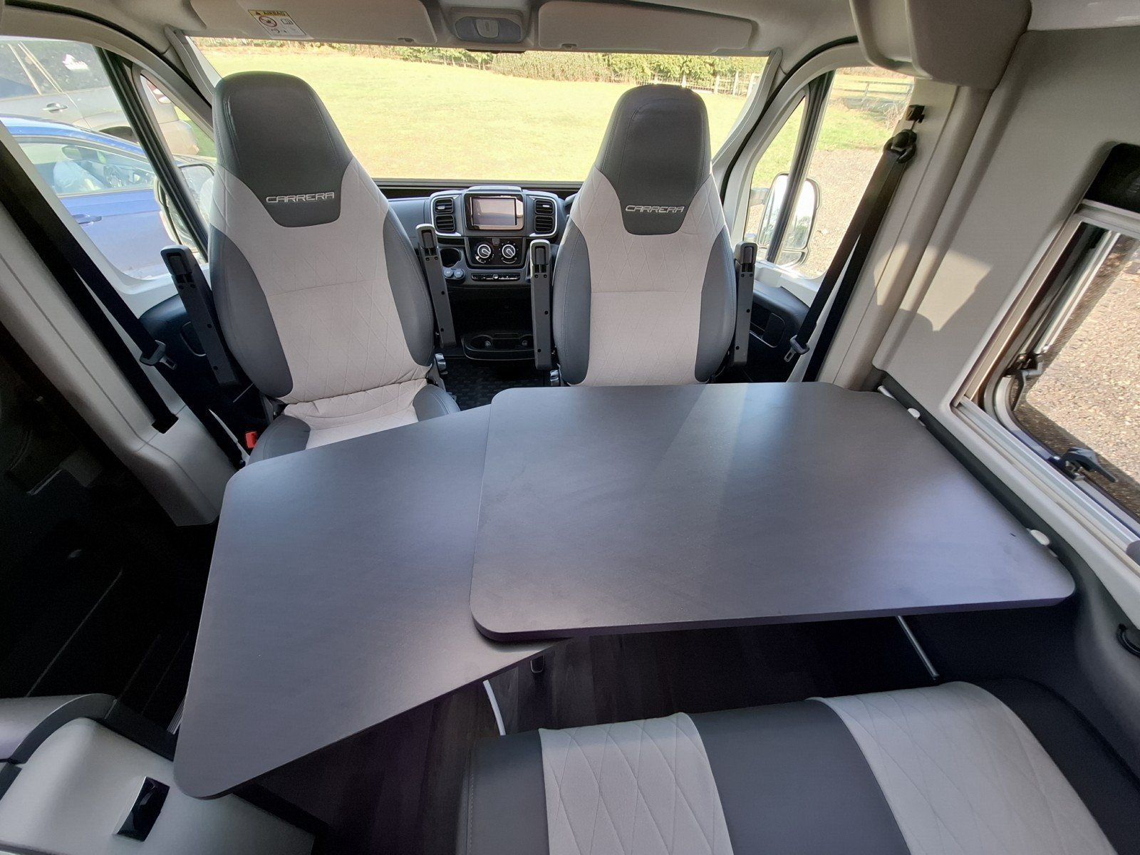 Behind the swivel cab seats on the driver’s side there is a forward facing seat (with two additional seat belts) fronted by a removable table. This area can be enhanced as a leisure/dining area by use of the swivel cab seats, or converted into a single berth).