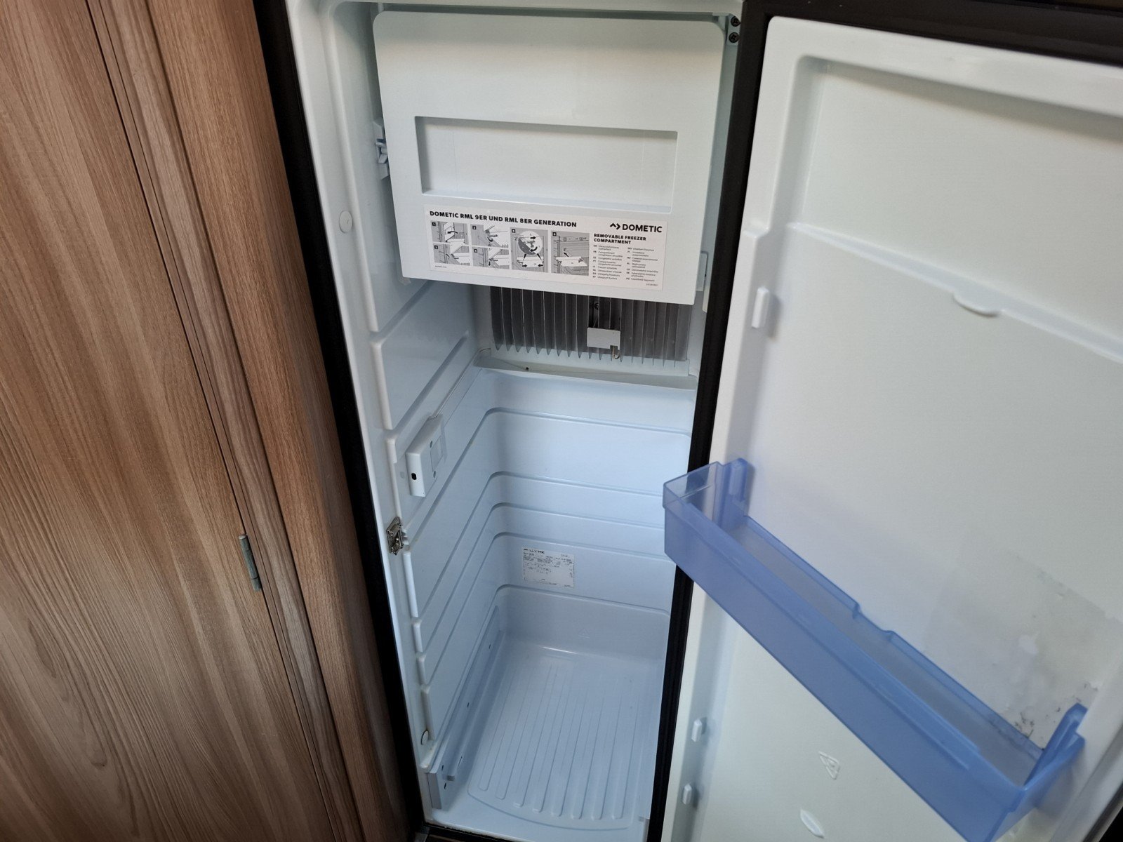 Beside the wet room is a large fridge with a freezer box, while opposite is the central kitchen, which features a hob with 3 gas burners, a combination oven/grill, a microwave, a fridge with a freezer box, and a sink.