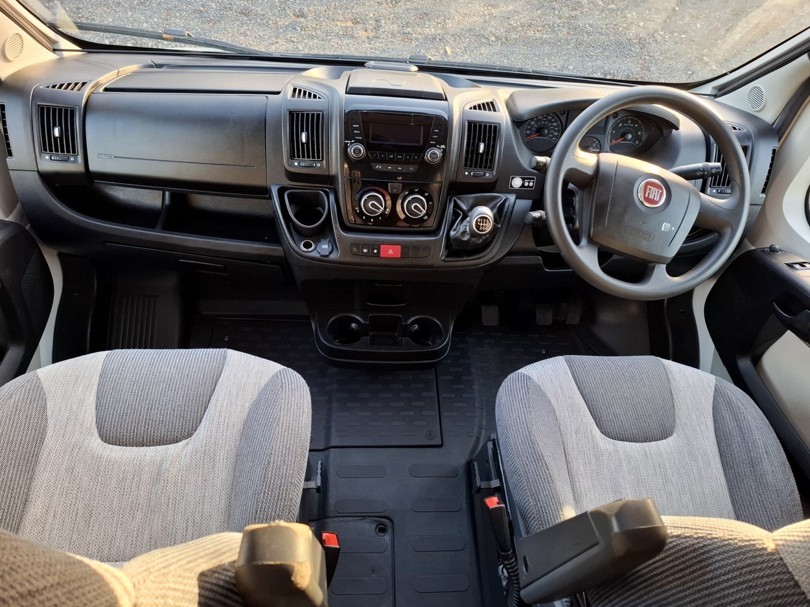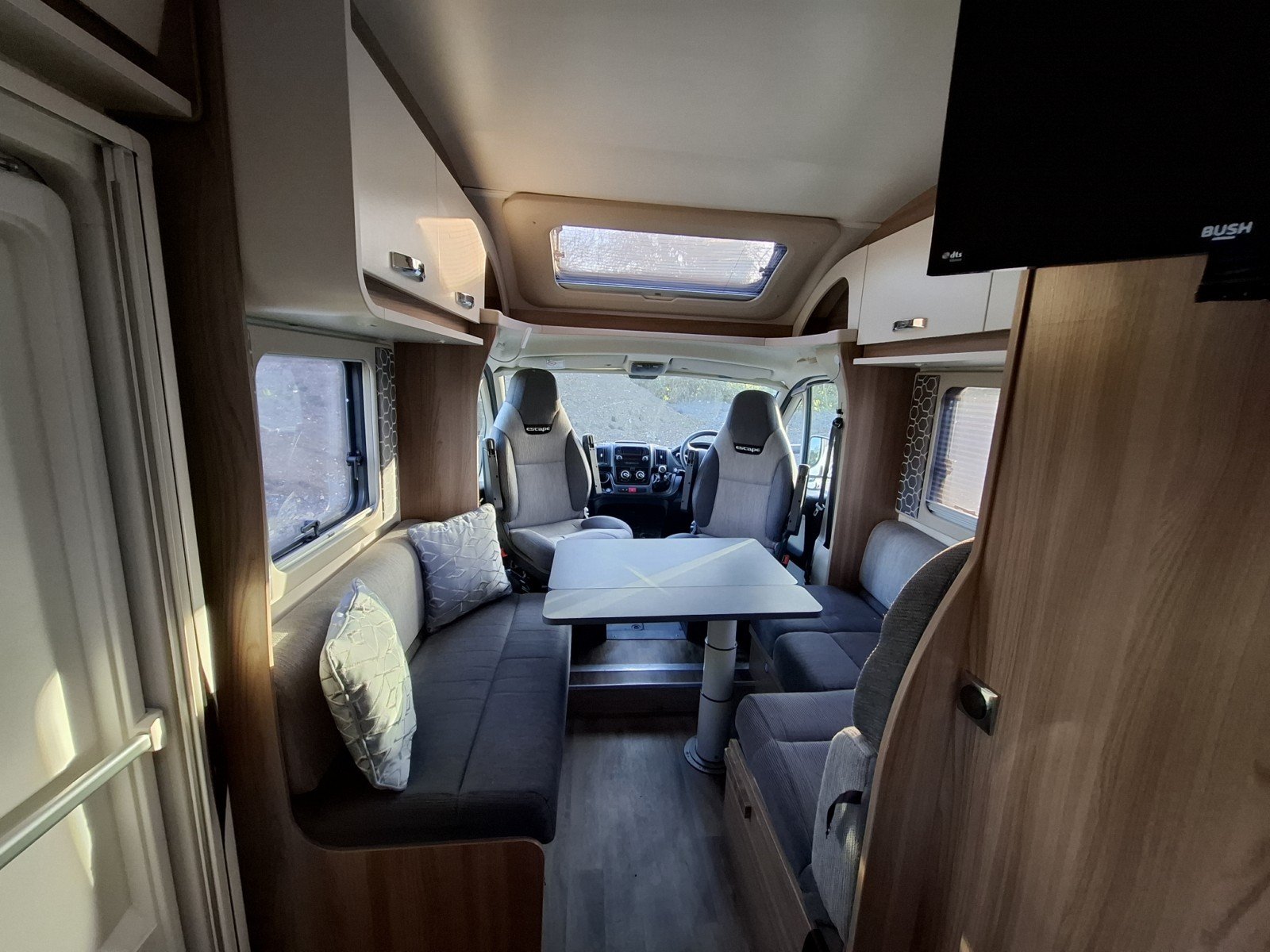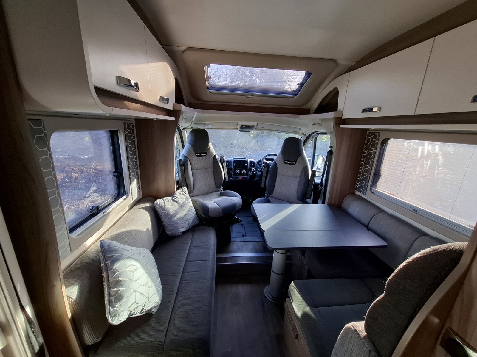 Behind the cab is offside L-shaped seating (with 2 additional seat belts), and a nearside side sofa around an adjustable table. This area can be enhanced for leisure/dining with the use of the cab swivel seats, and can be converted into a transverse double berth.
